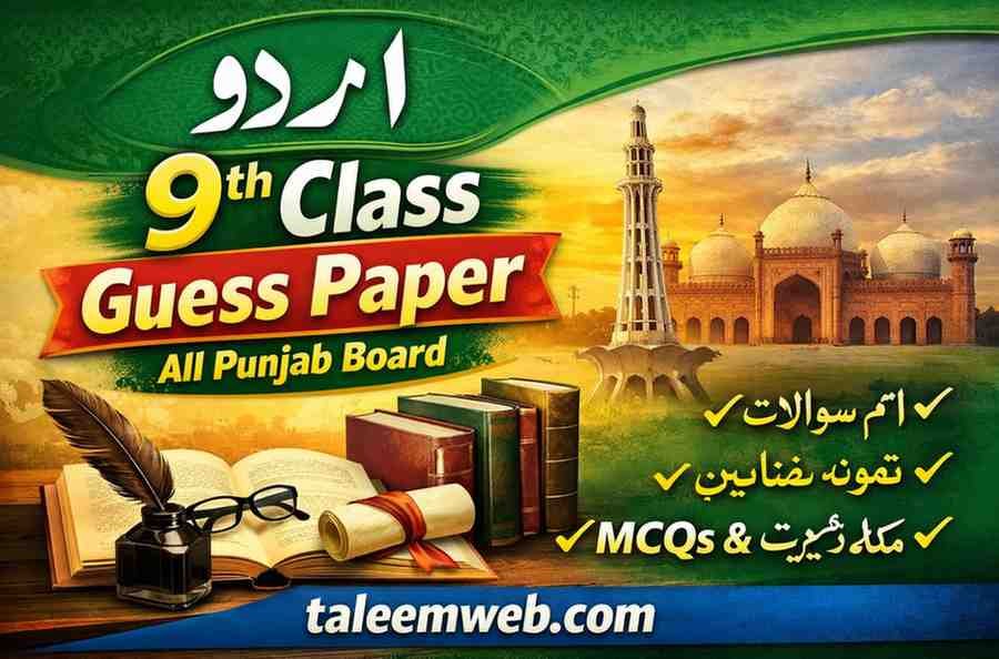 The Urdu 9th Class Guess Paper 2026 is very useful for students preparing for their annual board exams. This guess paper includes the most important short questions, long questions, poems, essays, and grammar questions for the annual board exams. This guess paper is prepared according to the latest Punjab Board syllabus and exam pattern.